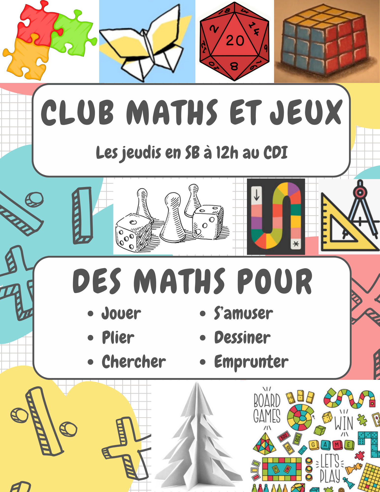 Le Club Maths et Jeux aura lieu les jeudis à 12h au CDI en semaine B.
