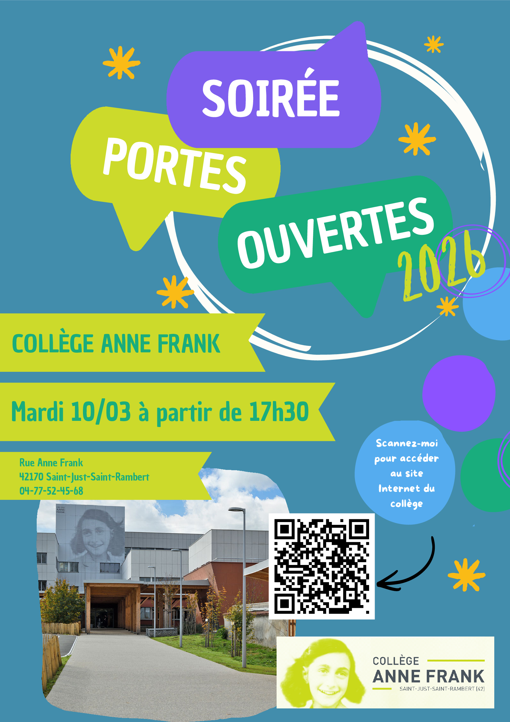Le collège a le plaisir de vous accueillir à l'occasion de ses portes ouvertes, qui se tiendront le mardi 10 mars de 17h30 à 20h00.